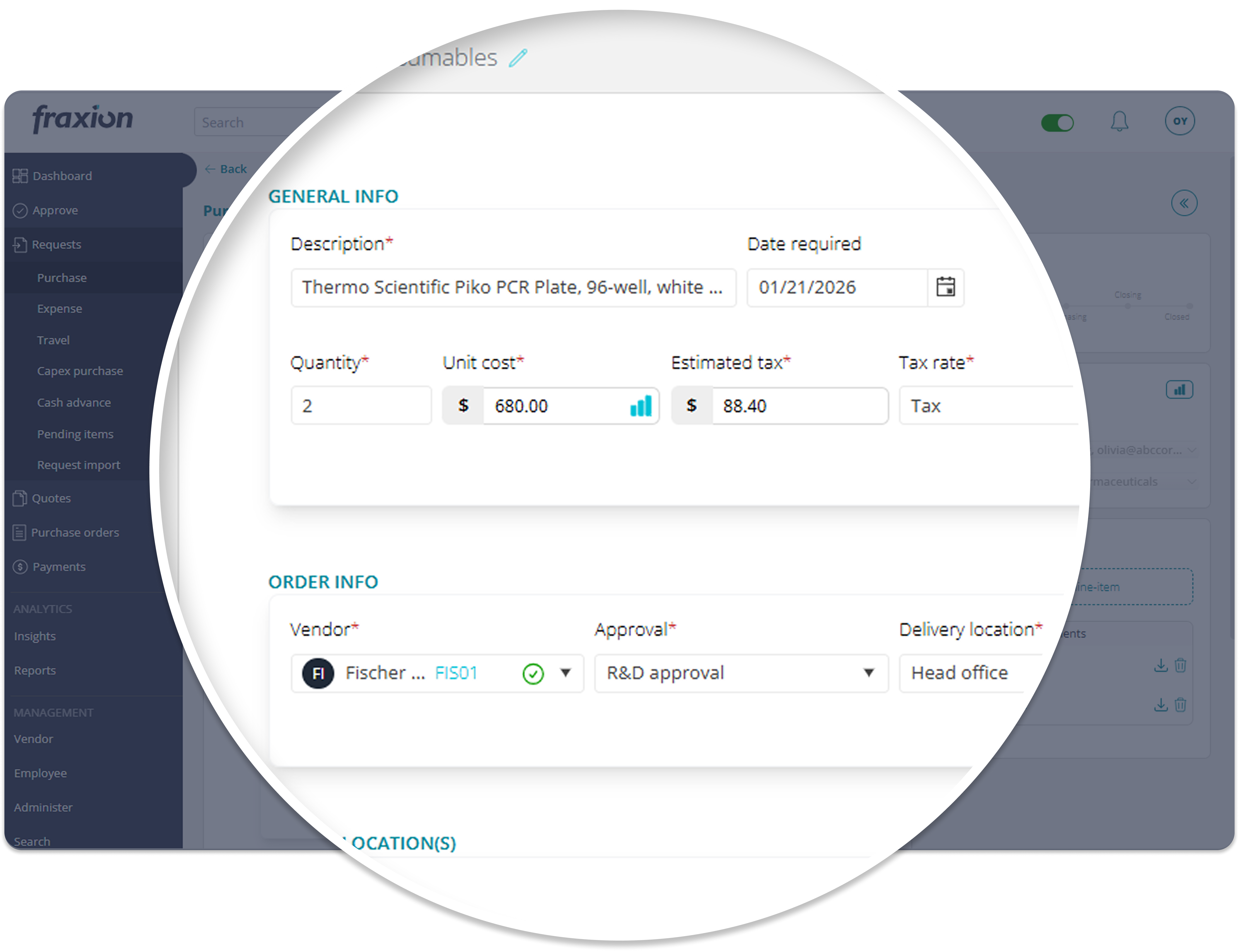 When managing multiple laboratories or healthcare facilities, staying on budget can be challenging. By centralizing processes, visibility, control, and records in Fraxion, healthcare purchasing processes are faster, easier and free up more time for valuable research and patient care.